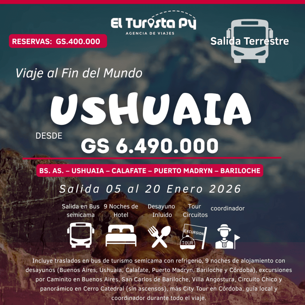 Viaje al Fin del Mundo 2026 🚍 | Salida terrestre desde Asunción a Ushuaia, Calafate, Puerto Madryn, Bariloche y Buenos Aires.